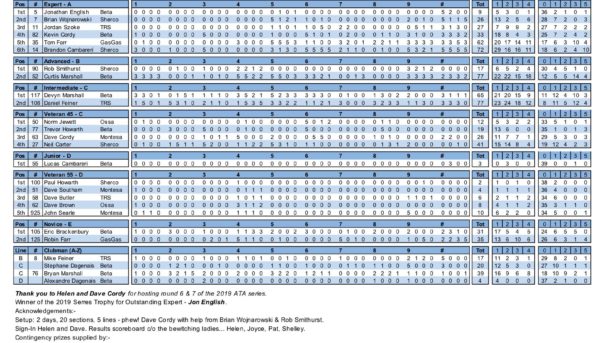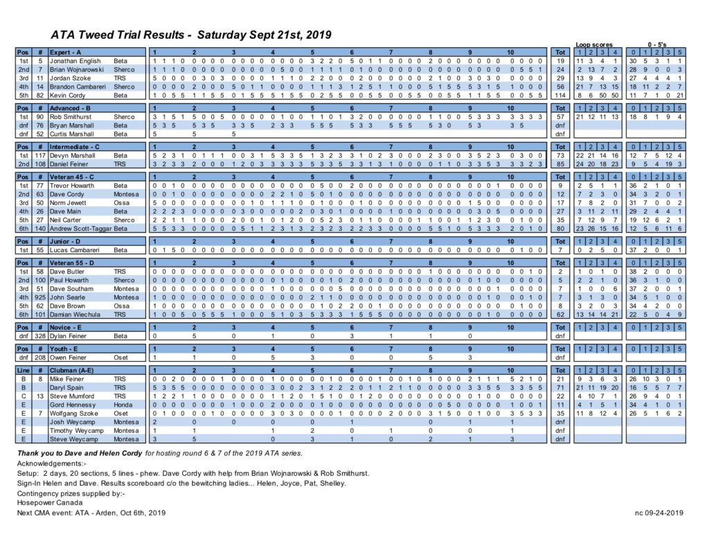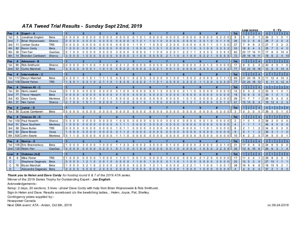 Thank you to Helen and Dave Cordy for hosting round 6 & 7 of the 2019 ATA series. Setup: Dave Cordy with help from Brian Wojnarowski & Rob Smithurst. 2 days, 20 sections, 5 lines, 4 different loops – phew! Sign-In Helen and Dave. Results scoreboard c/o the bewitching ladies… Helen, Joyce, Pat, Shelley. Contingency prizes from Hosepower Canada. 2019 winner of the Serres Trophy for Outstanding Expert – Jon English.
