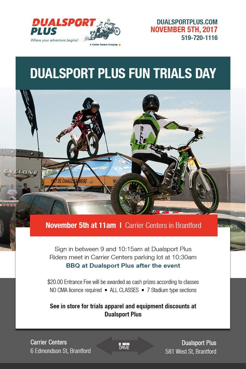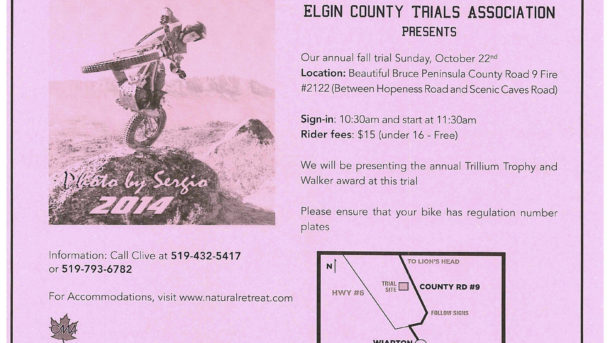 Next event: Nov 5th, 2017. Dualsport Plus Fun Day Trial – Brantford. Hosted by Southwestern Ontario Vintage Trials. (non CMA series)