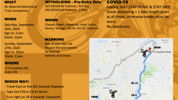 A reminder that this year’s ECTA Lion’s Head Trial will be organized in conjunction with the ATA, and held on Sunday, October 18th, 2020. Pre-entry registration is required as soon as possible, and by Saturday October 10th at the latest. Event organizers need to know how many riders will be attending to arrange sufficient parking, and section spacing. We are planning to have socially distant checkers at each section, so help from guests will be much appreciated. We have also made new arrangements this year for off-road discreet parking.
