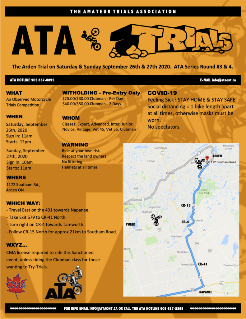 A reminder that this year’s ATA Arden Trial will be held on Saturday, September 26 & Sunday, September 27, 2020. Thanks to those who have already registered. For those who haven’t, pre-entry registration and payment are required by today to enter the event.